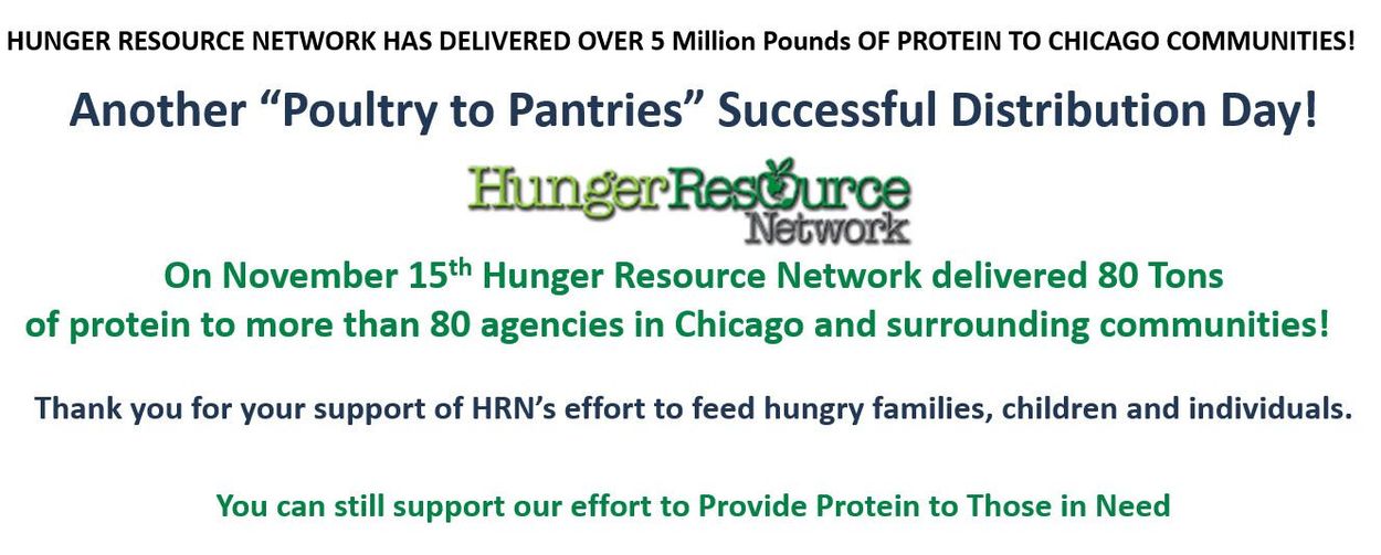 The Hunger Resource Network's mission is to aid in the alleviation of hunger by helping meet the needs of food pantries, soup kitchens, and shelters across Chicagoland. We are a 501(c)(3) certified non-profit organization.